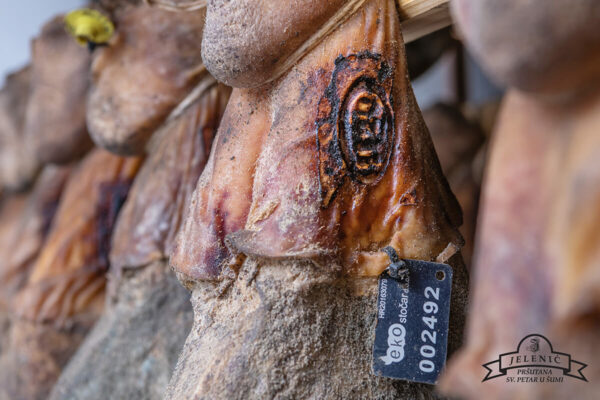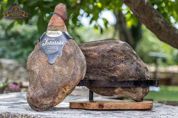 Istrian pršut is a preserved dry-cured meat product derived from carefully selected heavy pig breeds. It has a unique “violin” shape and when processed, the skin is removed and the hip bone is left intact. It is manually cured with sea salt and seasoned with pepper, garlic and a pinch of laurel leaves. After curing and ageing, it is left to dry for at least 12 months in dry air without smoking. During drying, the “pršut” is covered in noble moulds, which give it a unique